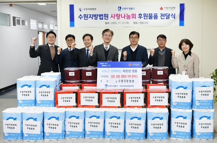 장수석 영통구청장은 “수원지방법원의 꾸준한 나눔 실천에 진심으로 감사드린다. 기탁된 물품을 도움이 필요한 가정에 소중히 전달하겠다”고 감사 인사를 전했다.