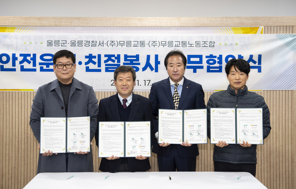 지금 울릉도가 달라지고 있다. 울릉도 중심에 (주)무릉교통승무원노동조합(위원장 박성하)이 친절에 앞장서고 있다. 울릉도 4개 단체인 무릉교통노동조합, 울릉군, 울릉경찰서, ㈜무릉교통무릉교통노동조합은 창립 1주년을 계기로 도동버스정류장에서 ‘안전운전 · 친절봉사’ 업무협약식을 맺었다. 이번 협약식은 울릉군 농어촌버스의 서비스 수준을 향상시키고 안전운행 문화를 정착시키기 위한 취지로 남한권 울릉군수, 남진복 도의원, 최병호 · 홍성근 울릉군의원, 최대근 울릉경찰서장 등 약 60여 명이 참석했다. 협약에서는 ▲ 웃는 얼굴로 먼저 인사하기 ▲ 난폭운전 금지 ▲ 승객 착석 확인 후 출발 ▲ 배차시간 준수 ▲ 차량 점검·청결 유지 ▲ 친절운행 실천 등 6대 실천과제를 공동 선언하고, 안전운전 결의문을 낭독한 뒤 농어촌버스 차량에 부착했다. 또한 대중교통 발전과 안전문화 조성에 기여한 관계자들에게 감사패가 수여됐으며, 지역사회 소통 강화를 위해 다양한 분야의 전문가들이 노동조합 자문위원으로 위촉됐다. 특히, 무릉교통노동조합은 지역사회 환원 활동으로 울릉도 초 · 중 · 고 학생들을 대상으로 한 장학금 전달이 진행됐으며, 오랫동안 지역 교통발전에 헌신해온 김효상 어르신에게