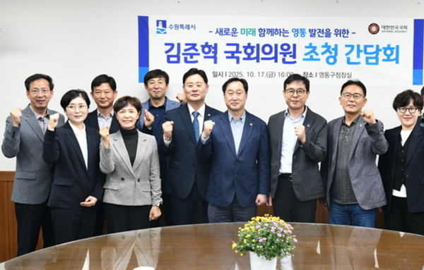 수원특례시 영통구(구청장 장수석)는 지난 17일, 구청장실에서 김준혁 국회의원 초청 간담회를 열고, 2025년 주요 사업과 구정 현안에 대한 협력 방안을 논의했다고 20일 밝혔다. 영통구에 따르면 "이번 간담회는 영통구의 지역 발전 방향과 주민 생활과 직결되는 현안 사업을 공유하며, 협력체계를 강화하기 위해 마련한 자리였다"고 설명했다. 이날 만남에는 김준혁 국회의원을 비롯해 최종현 경기도의원, 채명기·윤명옥·사정희 시의원, 등이 참석했다. 영통구에서는 구청장과 대민협력관, 관계 부서장이 자리를 함께했다. 회의에서는 ▲영통권 교통 환경 개선 ▲공원 및 녹지 공간 확충 ▲생활 인프라 조성 등 주민 체감도가 높은 사업을 중심으로 추진 상황을 점검하고, 지원 방향에 대해 의견을 나눴다. 김준혁 국회의원은 “영통구는 수원시 발전에 있어 중요한 역할을 하고 있는 지역"이라며"논의된 사업들이 차질 없이 추진될 수 있도록 적극 지원하겠다”고 전했다. 장수석 영통구청장은 “주민들의 삶과 가장 가까운 행정이 바로 구정이다. 오늘 논의된 사안들이 실질적인 변화로 이어질 수 있도록 의원님들과 지속적으로 협력하겠다”고 밝혔다.