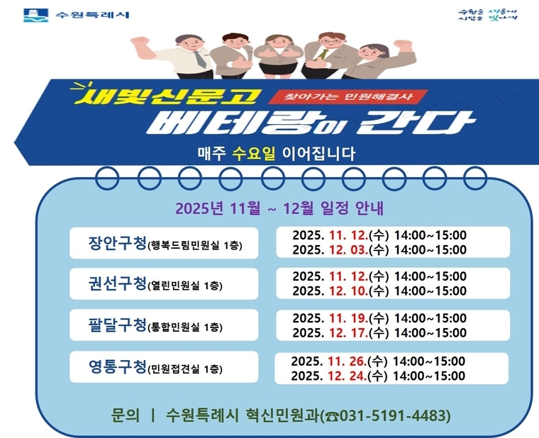 수원특례시 임정완 시민협력교육국장은 "'새빛신문고 베테랑이 간다'는 현장에서 시민의 목소리를 듣고, 문제점이 있으면 해결책을 모색해 나가는 찾아가는 민원 상담 서비스"라고 강조했다.