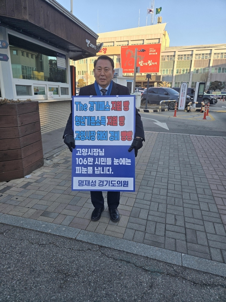 경기도의회 도시환경위원회 소속 명재성 의원(더불어민주당·고양5)이 고양시의 ‘The 경기패스’와 청년기본소득 예산 미편성을 강하게 비판하며 8일 고양시청 앞에서 1인 시위에 나섰다.