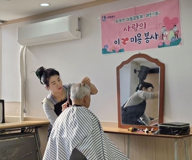수원시 영통구 매탄1동행정복지센터(동장 김은정)는 "지난 13일, 자원봉사 재능기부로 이·미용 서비스를 진행하고 취약가구 3명의 어르신 머리를 정갈하게 손질하며 삶의 활력을 불어넣는 뜻깊은 시간을 마련했다"고 14일 밝혔다.